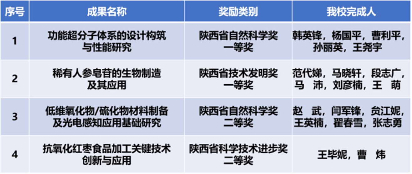 437ccm·必赢国际化材学院韩英锋教授主持的“功能超分子体系的设计构筑与性能研究”获省自然科学奖一等奖,化工学院范代娣教授主持的“稀有人参皂苷的生物制造及其应用”获省技术发明奖一等奖,信息学院赵武教授主持的“低维氧化物/硫化物材料制备及光电感知应用基础研究”获省自然科学奖二等奖,食品学院王毕妮教授主持的“抗氧化红枣食品加工关键技术创新与应用”获省科技进步奖二等奖。此外,437ccm·必赢国际参与的“秦岭主要珍稀野生动物抢救饲养繁育关键技术研究”和“陆相页岩油气地质工程一体化的负碳清洁开发技术”分别获得省科技进步奖二等奖。