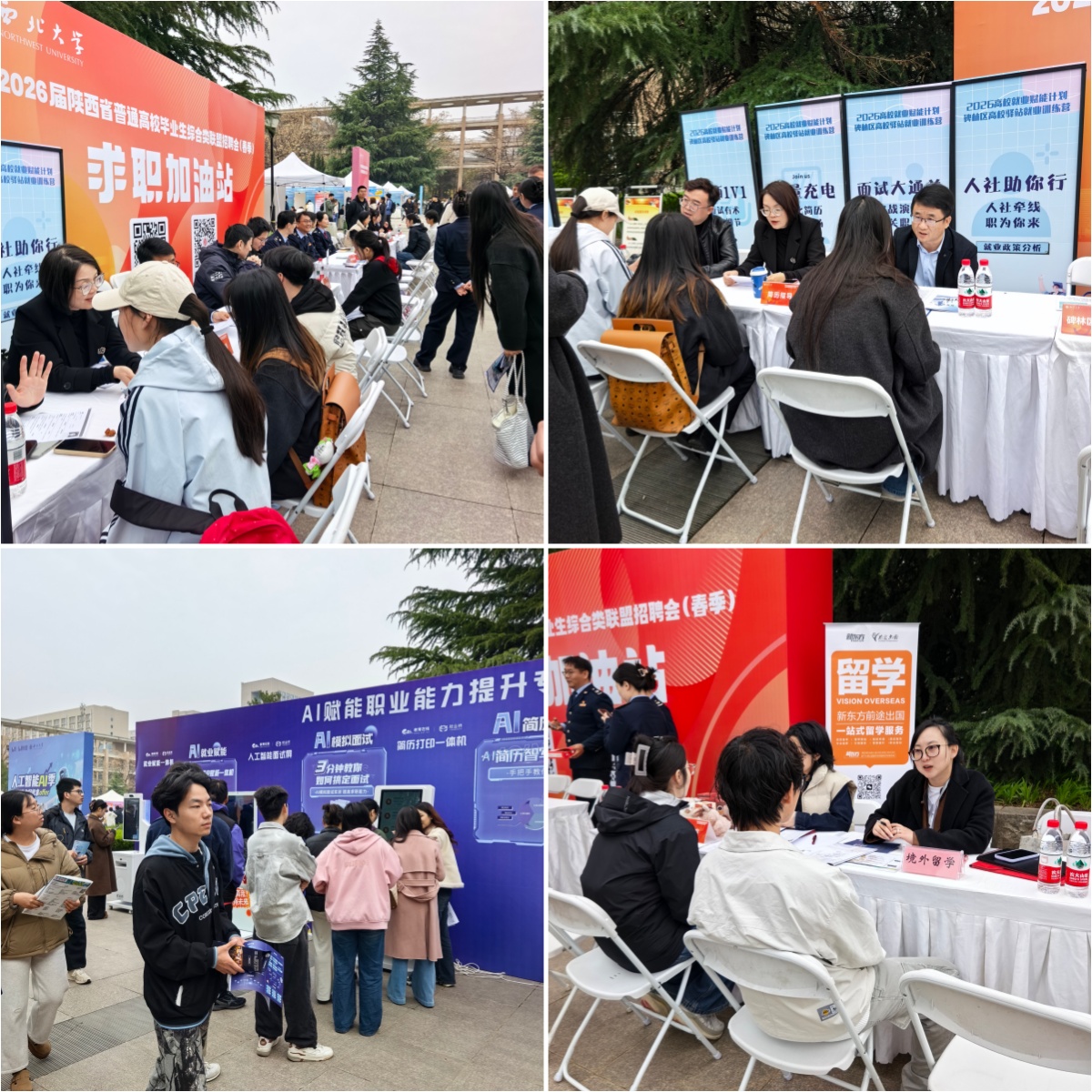 春季开学以来,学校举办了重点地域、重点行业、博硕巡回专场等校园专场招聘会70余场(次),开展公考选调培训、简历诊断、人工智能培训、求职经验分享等各类就业指导活动30余场。此外,校领导带队参加广东“百万英才汇南粤”大型招聘会,实地走访比亚迪、VIVO移动通信、吉利汽车、招商银行西安分行等重点用人单位,大力拓展就业市场,开发优质岗位资源。