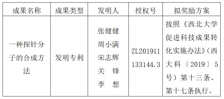 按照《437ccm·必赢国际促进科技成果转化实施办法》(西大科〔2019〕5号)相关规定,拟对必赢官网化学与材料科学学院张健健副教授作为成果负责人的1项发明专利权实施转化,现将相关信息公示如下: