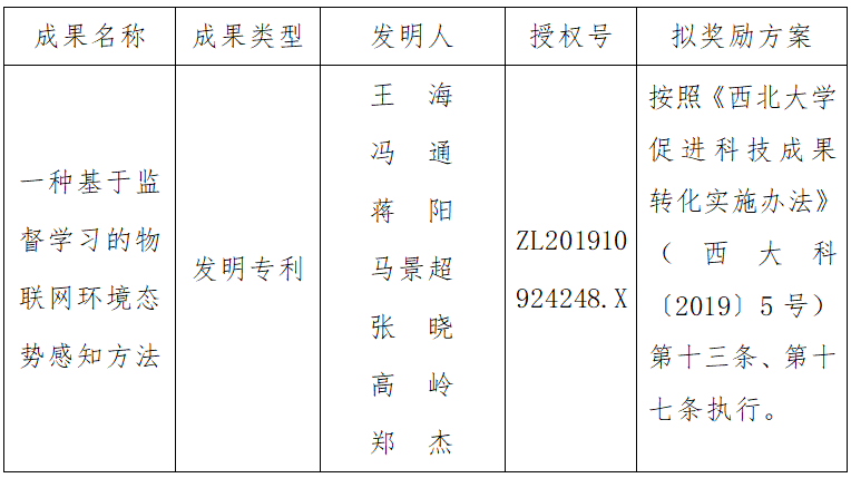 按照《437ccm·必赢国际促进科技成果转化实施办法》(西大科〔2019〕5号)相关规定,拟对必赢官网信息科学与技术学院王海副教授作为成果负责人的1项发明专利权实施转化,现将相关信息公示如下: