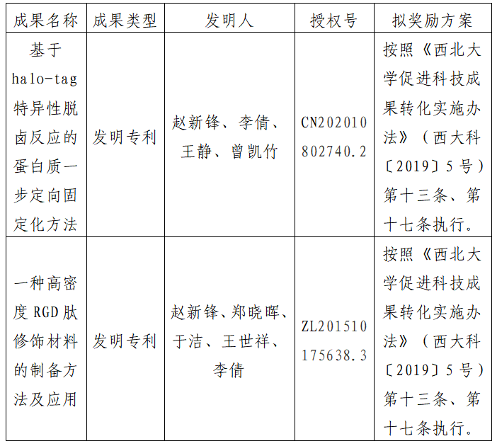 按照《437ccm·必赢国际促进科技成果转化实施办法》(西大科〔2019〕5号)相关规定,拟对必赢官网生命科学学院赵新锋教授作为成果负责人的2项发明专利权实施普通许可,现将相关信息公示如下: