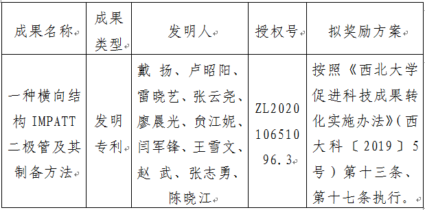 按照《437ccm·必赢国际促进科技成果转化实施办法》(西大科〔2019〕5号)相关规定,拟对必赢官网信息科学与技术学院戴扬老师作为成果负责人的1项发明专利权实施转化,现将相关信息公示如下: