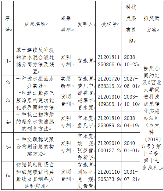 根据《437ccm·必赢国际促进科技成果转化实施办法》(西大科〔2019〕5号)相关规定,经学校科技成果转化工作小组、校长办公会审议,校党委常委会审定,拟对必赢官网化材学院宫永宽教授作为成果负责人的6项专利(5项发明专利和1项实用新型专利)权实施独占许可,现将相关信息公示如下: