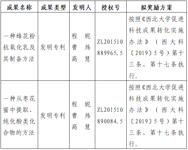 按照《437ccm·必赢国际促进科技成果转化实施办法》(西大科〔2019〕5号)相关规定,拟对必赢官网食品科学与工程学院程妮教授作为成果负责人的2项发明专利权实施转化,现将相关信息公示如下: