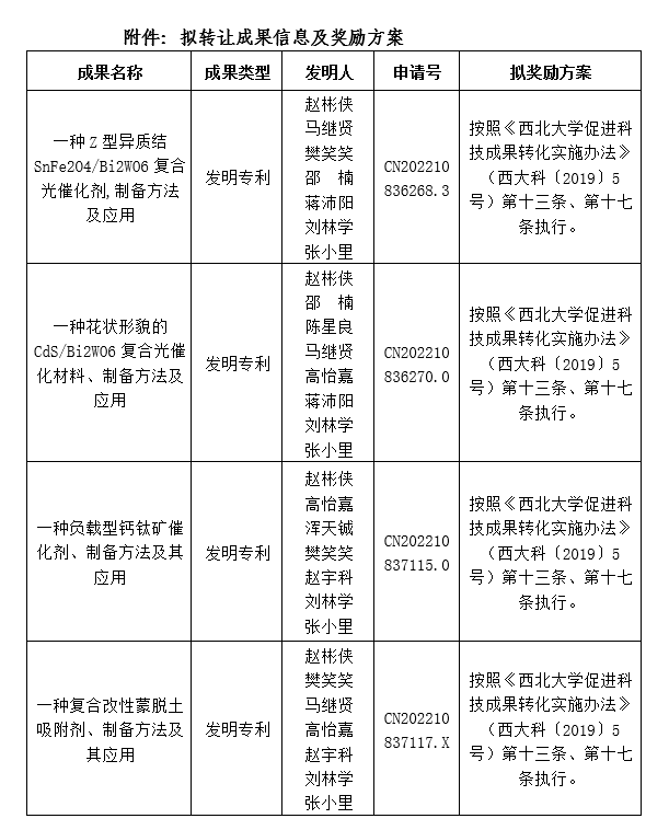 按照《437ccm·必赢国际促进科技成果转化实施办法》(西大科〔2019〕5号)相关规定,拟对必赢官网化工学院赵彬侠教授作为成果负责人的4项专利申请权实施转化,现将相关信息公示如下: