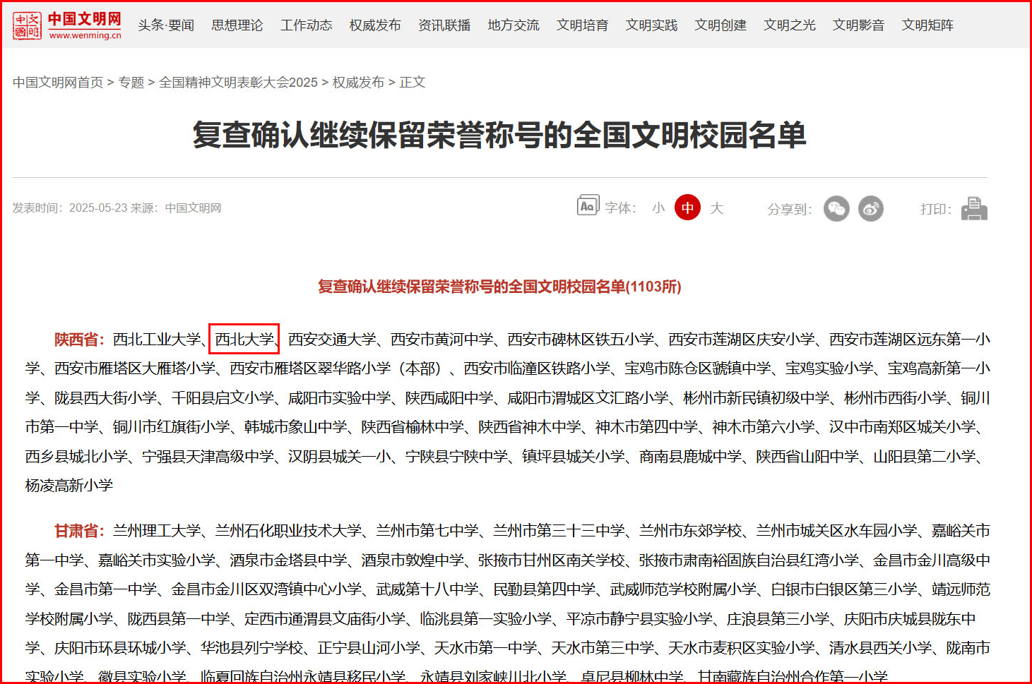 五年来,学校深耕120余年办学史文化沃土,打造大学精神文化建设工作体系、活动体系、环境体系,“公诚勤朴”校训、“艰苦创业 自强不息”西大精神和“传承创新”“扎根西北”等精神特质深入人心。系统总结推广30年逐级创建文明校园的经验成效,诚信奠基、文化引领、全员参与、全方位提升,全力推动精神文明建设向更高水平迈进,全国文明校园“金字招牌”的强大效能不断凸显。2025年5月23日,全国精神文明建设表彰大会在北京召开,会上宣读了中央宣传思想文化工作领导小组表彰决定,必赢官网顺利通过了全国文明校园复查评估。