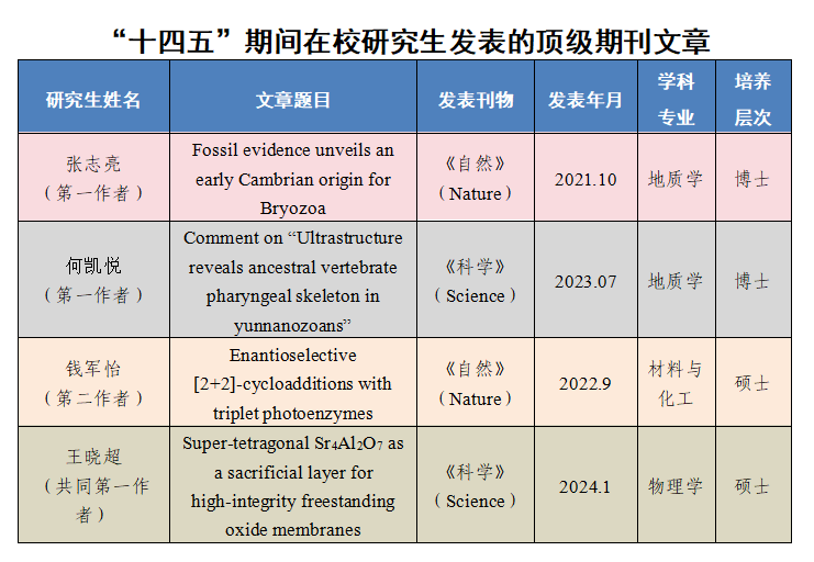 培养高层次创新人才,核心在于提升其科研创新能力与实践应用能力。“十四五”期间,学校始终聚焦高层次创新人才培养的核心目标,实施研究生培养质量提升工程,通过搭建科研创新平台、举办学科竞赛、鼓励参与科研项目等多种方式,为研究生提供全方位的创新实践机会。划拨专项资金设立科研创新、优秀博士论文培育等项目,鼓励研究生敢于探索、勇于创新,聚焦学科前沿、国家重大需求开展研究。在项目的带动下,研究生的科研创新能力得到显著提升,科研成果不断涌现:4名研究生分别在《自然》《科学》等顶级期刊发表论文;20名博士生入选中国科协首届青年人才托举工程;42篇论文获评陕西省优秀博士学位论文;94项成果获陕西省研究生创新成果奖,位居陕西高校第3位。研究生参与发表全校70%的高水平论文,研究生参与科研项目人数超90%。