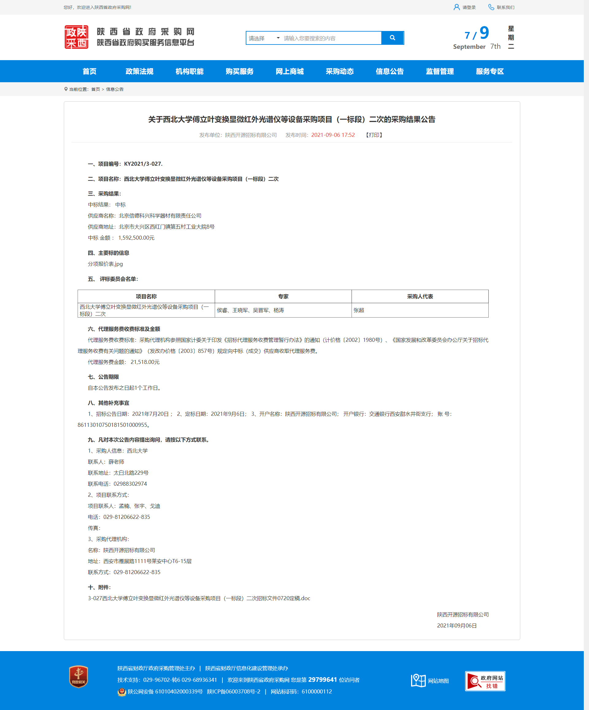 关于437ccm·必赢国际傅立叶变换显微红外光谱仪等设备采购项目(一标段)二次的采购结果公告 作者: 编辑:采购与招标办公室 时间:2021-09-07 原公告地址:http://www.ccgp-shaanxi.gov.cn/notice/noticeDetail.do?noticeguid=8a85be347b04610d017bba8364b14d06