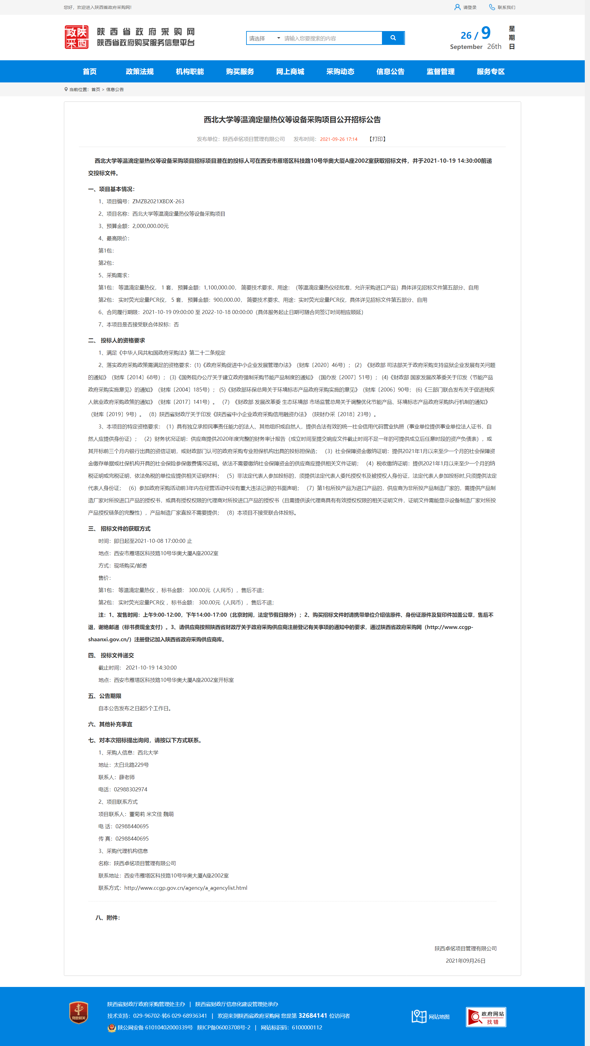 437ccm·必赢国际等温滴定量热仪等设备采购项目公开招标公告 作者: 编辑:采购与招标办公室 时间:2021-09-26 原公告地址:http://www.ccgp-shaanxi.gov.cn/notice/noticeDetail.do?noticeguid=8a85be317c20d707017c21545fc51220