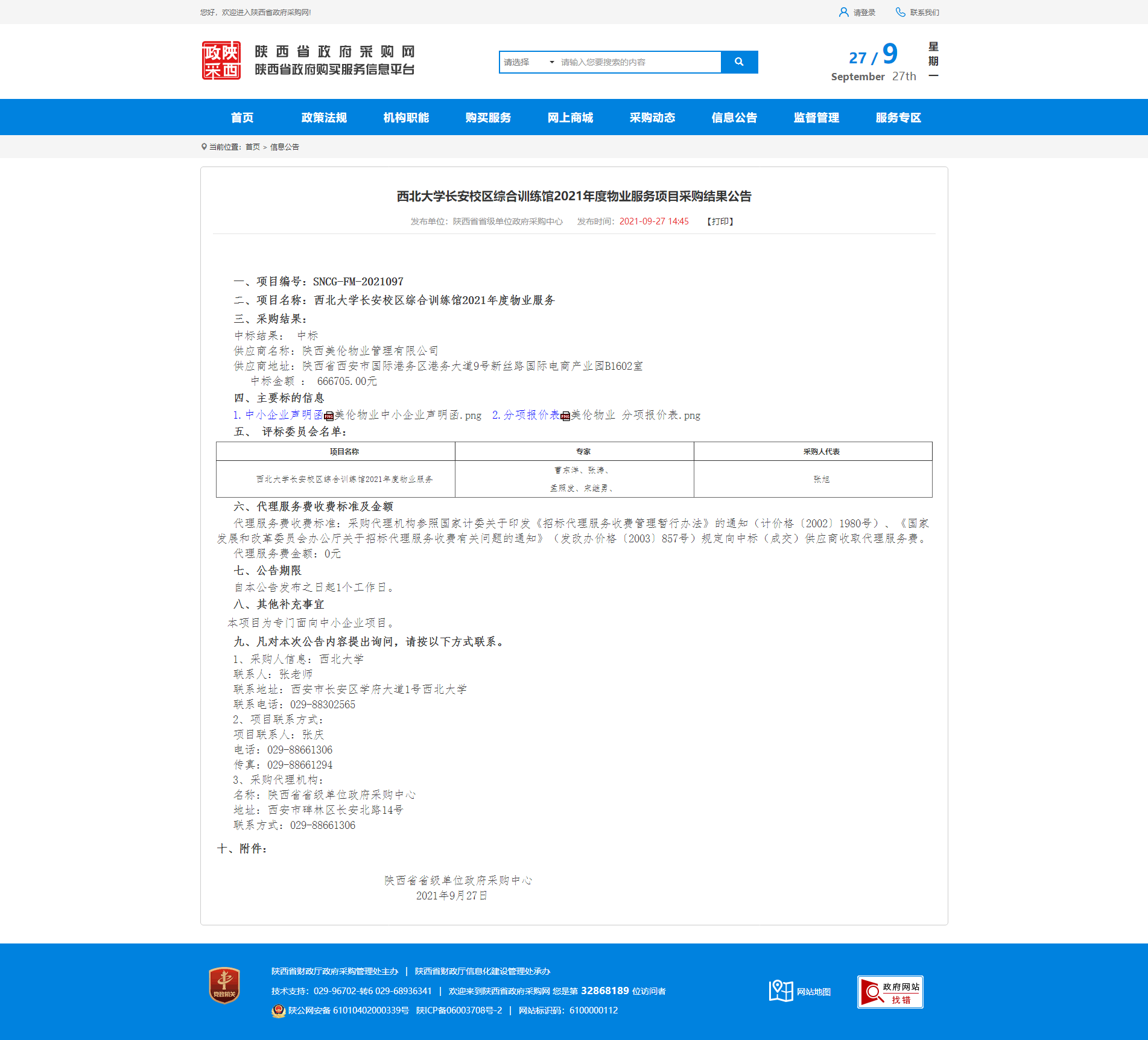 关于437ccm·必赢国际长安校区综合训练馆2021年度物业服务项目采购结果公告