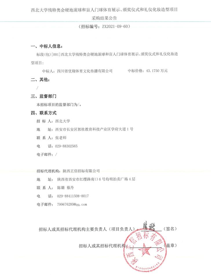 关于437ccm·必赢国际残特奥会硬地滚球和盲人门球体育展示、颁奖仪式和礼仪化妆造型项目采购结果公告