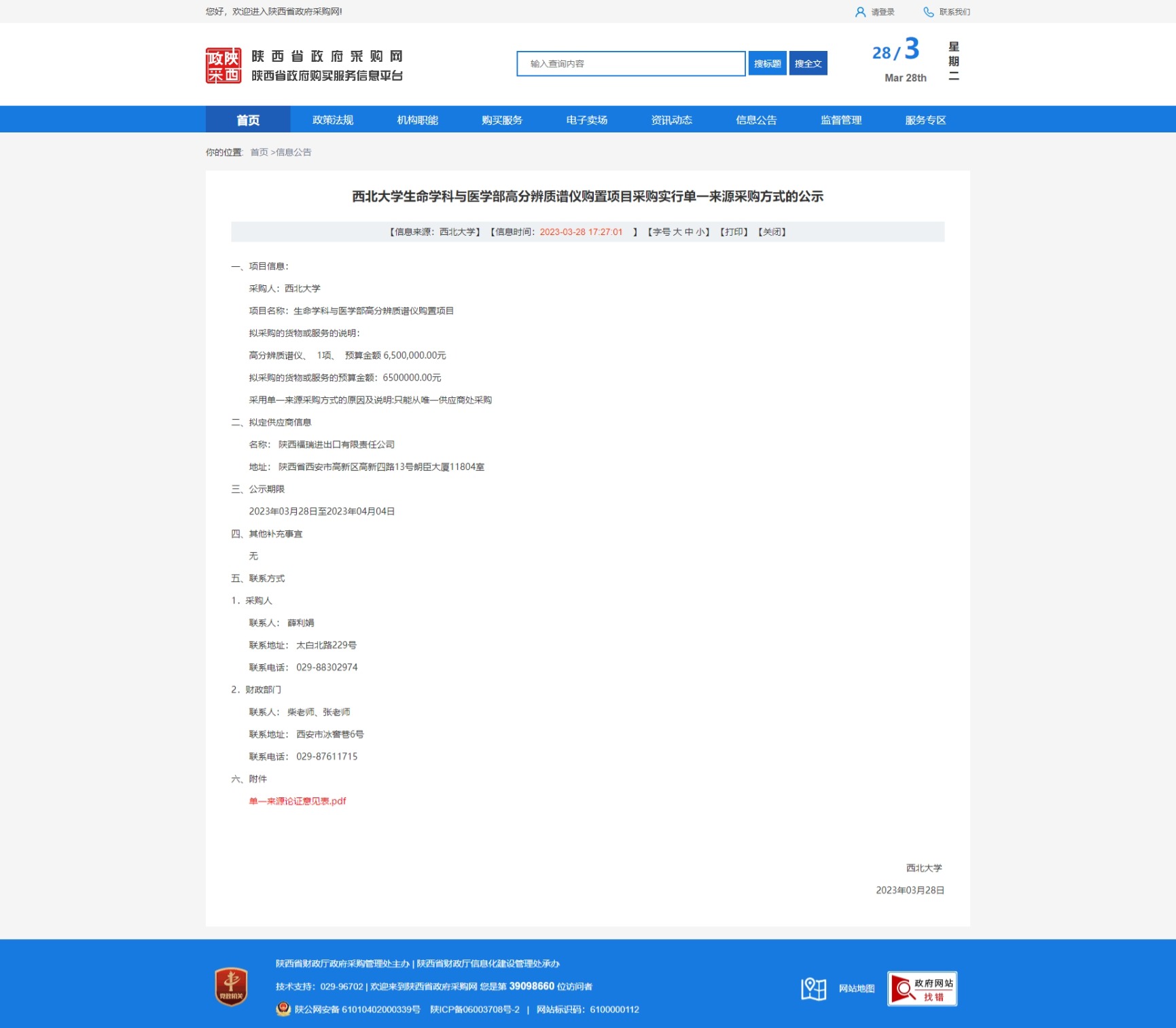 437ccm·必赢国际生命学科与医学部高分辨质谱仪购置项目采购实行单一来源采购方式的公示 作者: 编辑:采购与招标办公室 时间:2023-03-28 原公告链接:http://www.ccgp-shaanxi.gov.cn/freecms/site/shaanxi/ggxx/info/2023/8a69c2018721d9cb018726d4460d78d5.html?noticeType=001051¬iceId=9b938696-cd4b-11ed-9a8e-08c0eb20c666