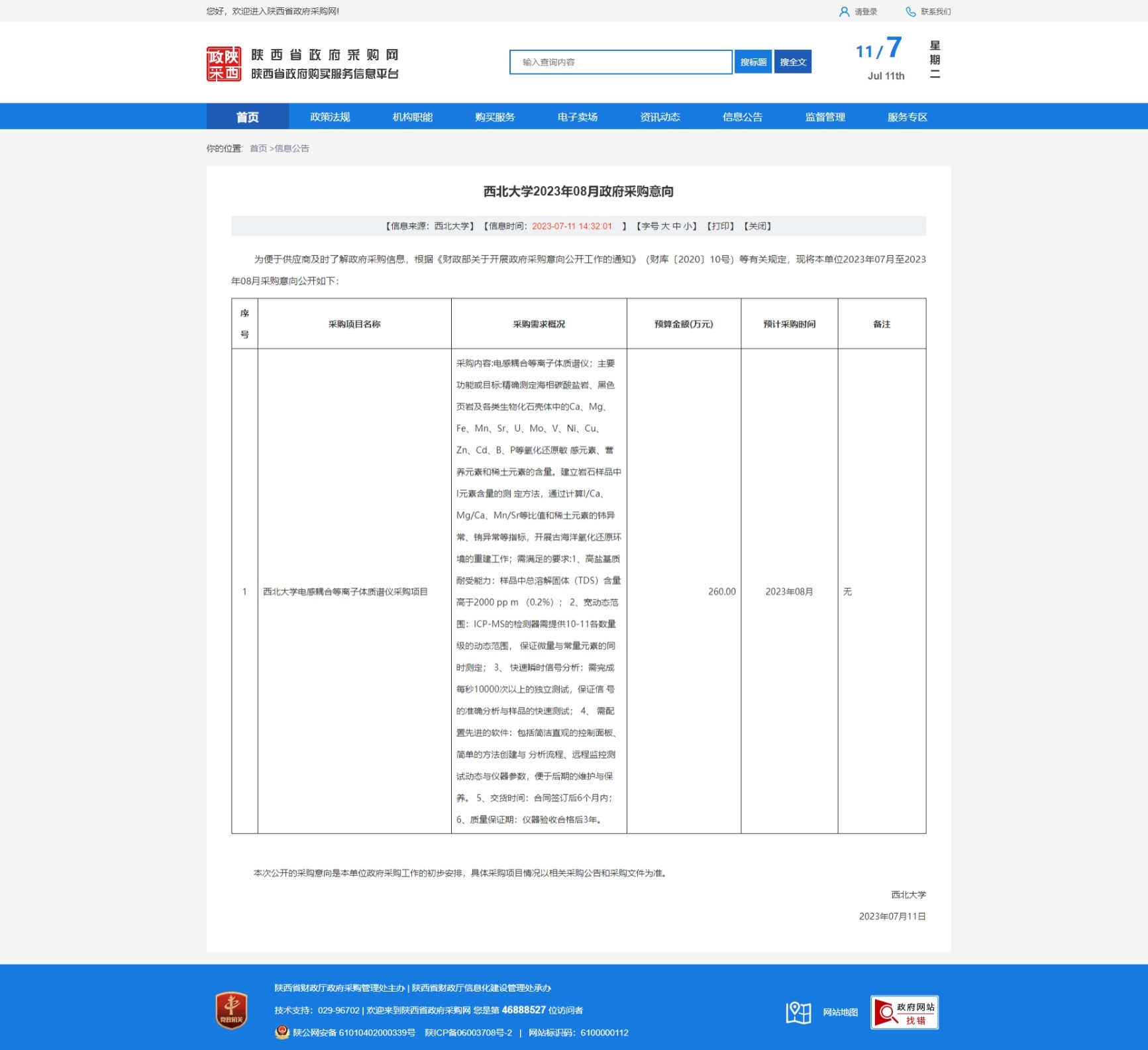 437ccm·必赢国际2023年08月政府采购意向 作者: 编辑:采购与招标办公室 时间:2023-07-11 原公告链接:http://www.ccgp-shaanxi.gov.cn/freecms/site/shaanxi/ggxx/info/2023/8a69c1f4893dd1c301893e96750d16d6.html?noticeType=59¬iceId=c1894944-1fb5-11ee-9a8e-08c0eb20c666