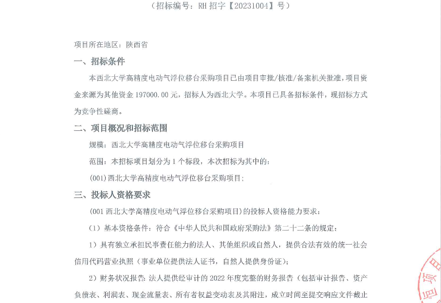 437ccm·必赢国际高精度电动气浮位移台采购项目竞争性磋商公告 作者: 编辑:采购与招标办公室 时间:2023-10-18 原公告链接:http://bulletin.sntba.com/biddingBulletin/2023-10-17/735313.html