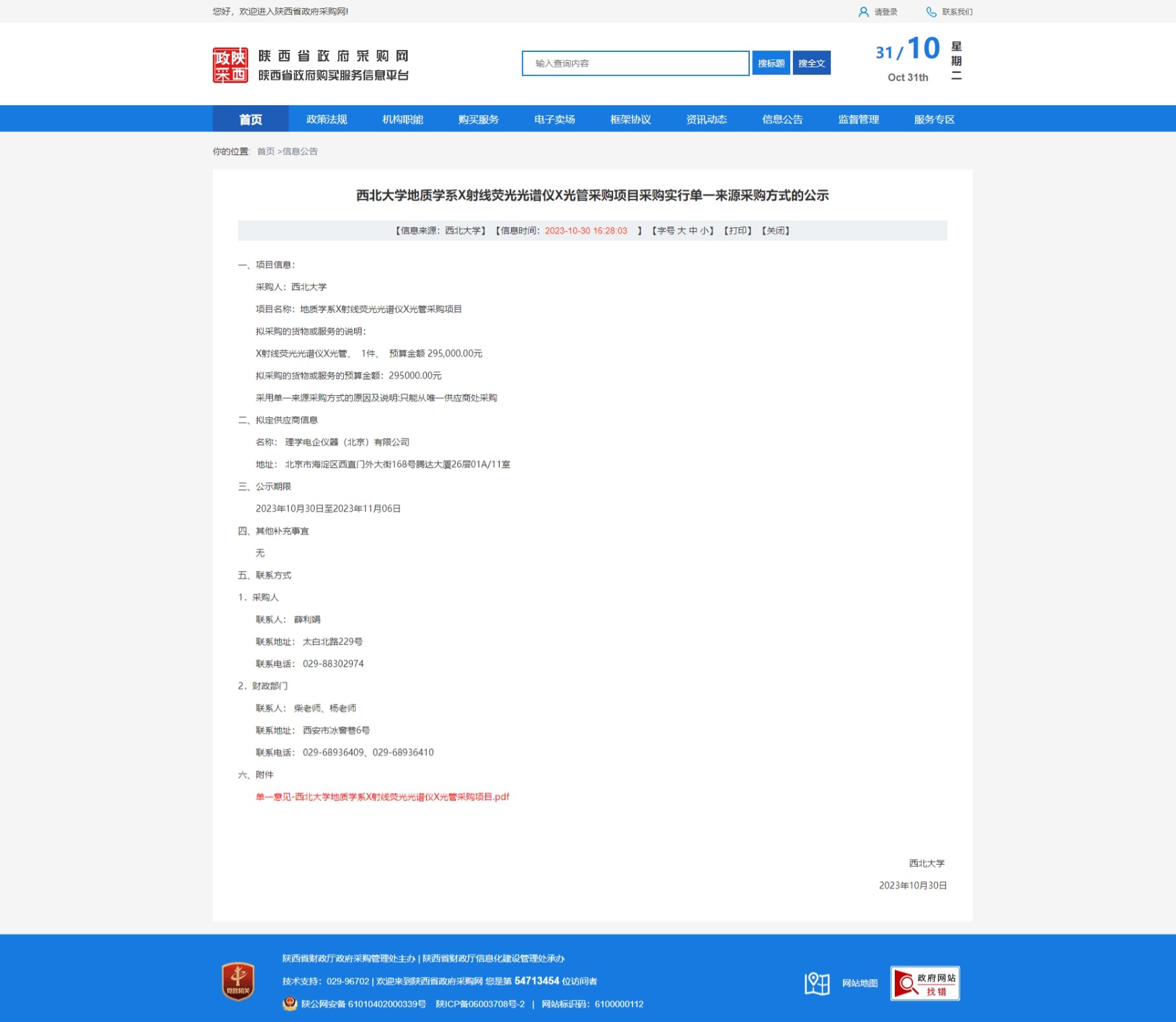 437ccm·必赢国际地质学系X射线荧光光谱仪X光管采购项目采购实行单一来源采购方式的公示 作者: 编辑:采购与招标办公室 时间:2023-10-31 原公告链接:http://www.ccgp-shaanxi.gov.cn/freecms/site/shaanxi/ggxx/info/2023/8a69c9798b7366a8018b7fabb9f2065e.html?noticeType=001051¬iceId=8d5cb875-76ff-11ee-9a8e-08c0eb20c666