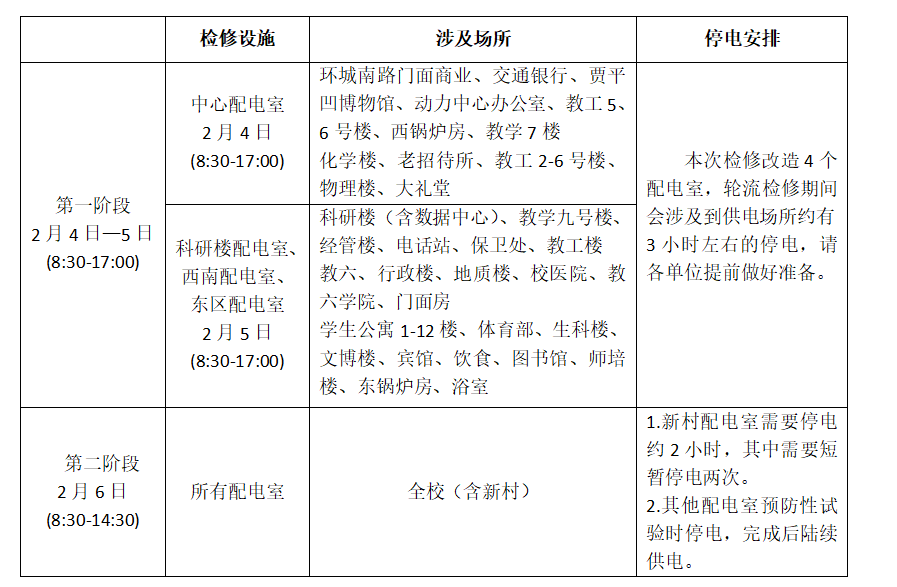 为进一步提升必赢官网太白校区电力系统运行效能,增强供电保障能力,更好地为全校师生教学科研及生活用电提供可靠服务,经与国网西安市区供电公司协商,必赢官网计划2月4日—2月6日对太白校区供电设施进行检修改造并进行预防性试验。