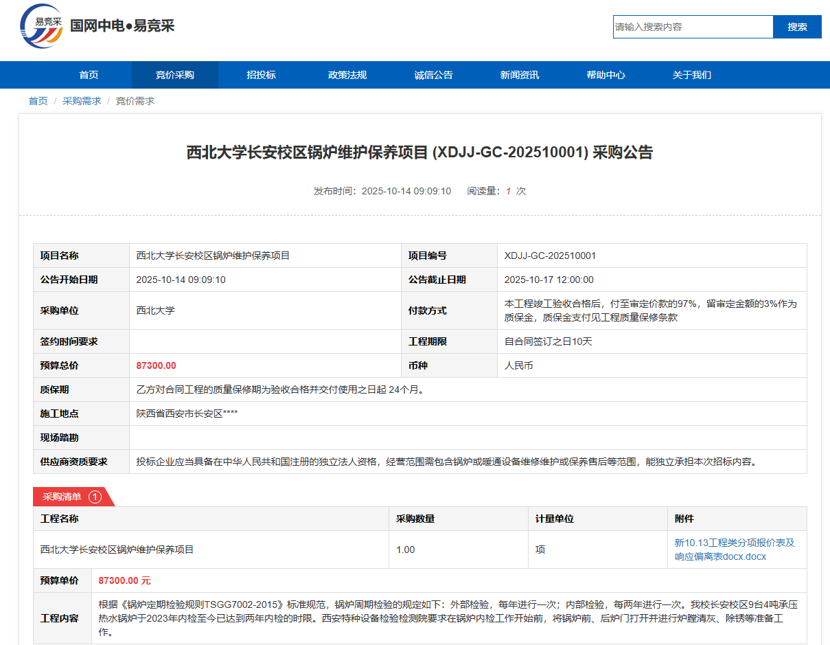 437ccm·必赢国际长安校区锅炉维护保养项目(XDJJ-GC-202510001)竞价采购公告