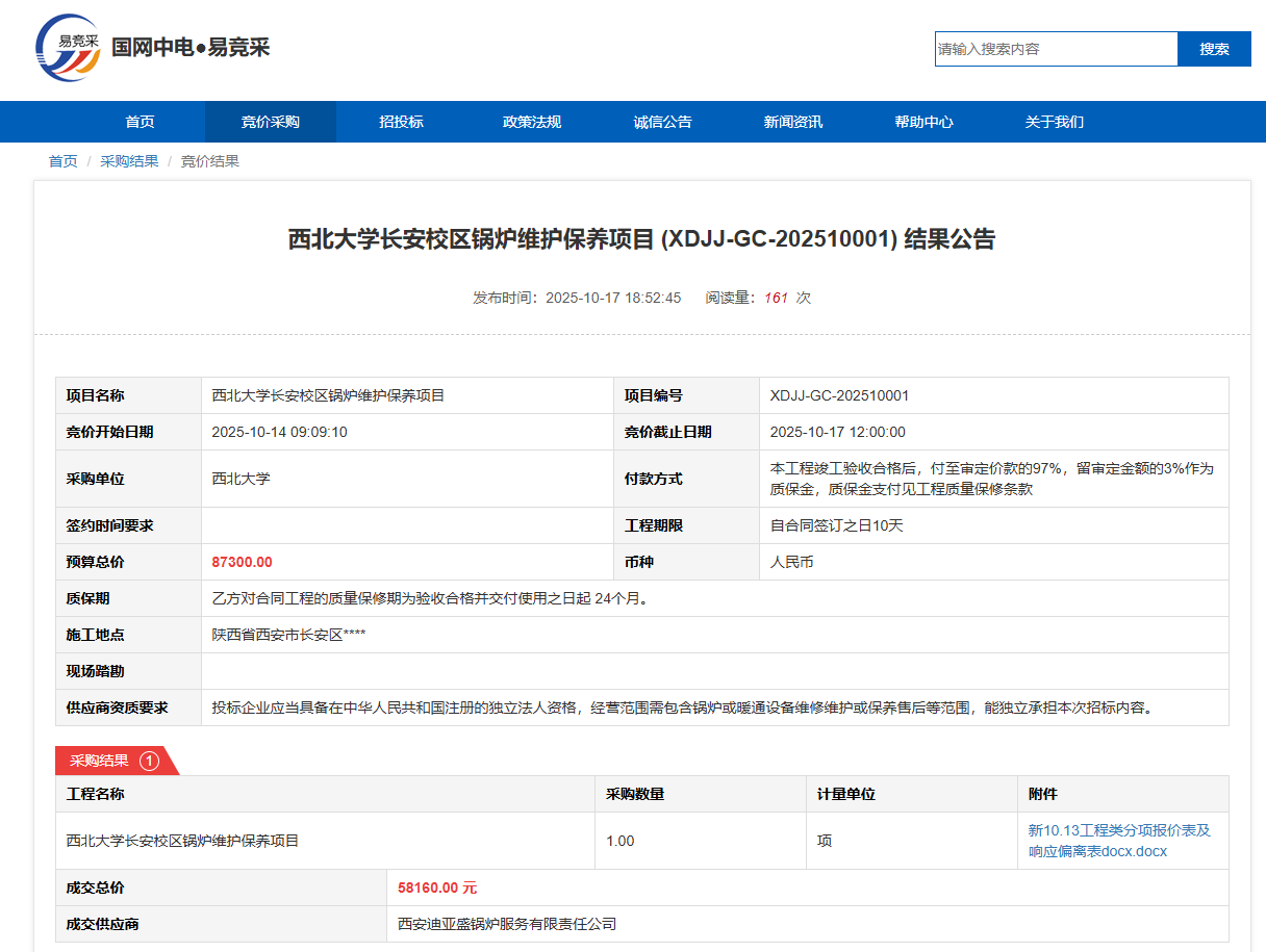437ccm·必赢国际长安校区锅炉维护保养项目(XDJJ-GC-202510001)竞价结果公告