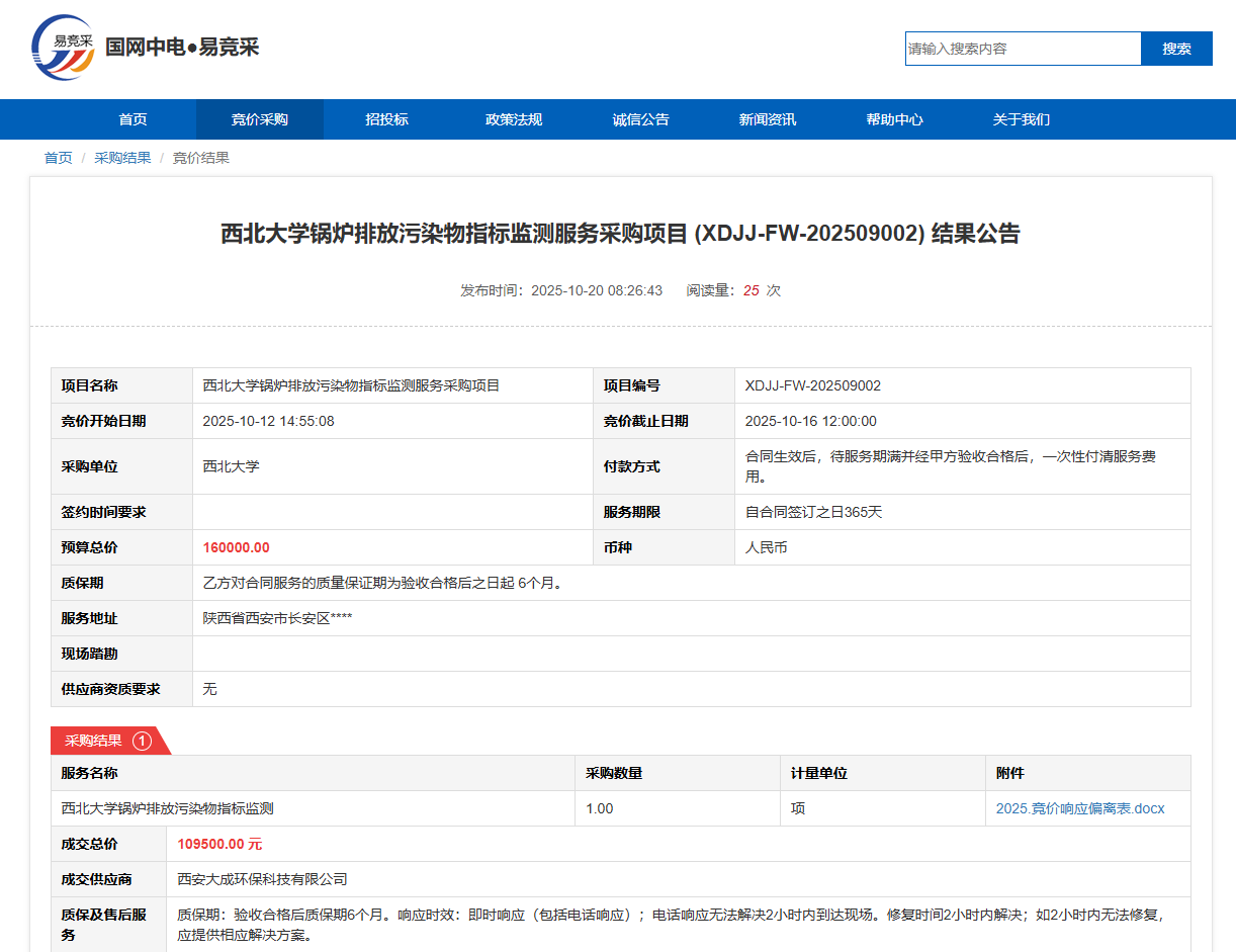 437ccm·必赢国际锅炉排放污染物指标监测服务采购项目(XDJJ-FW-202509002)竞价结果公告