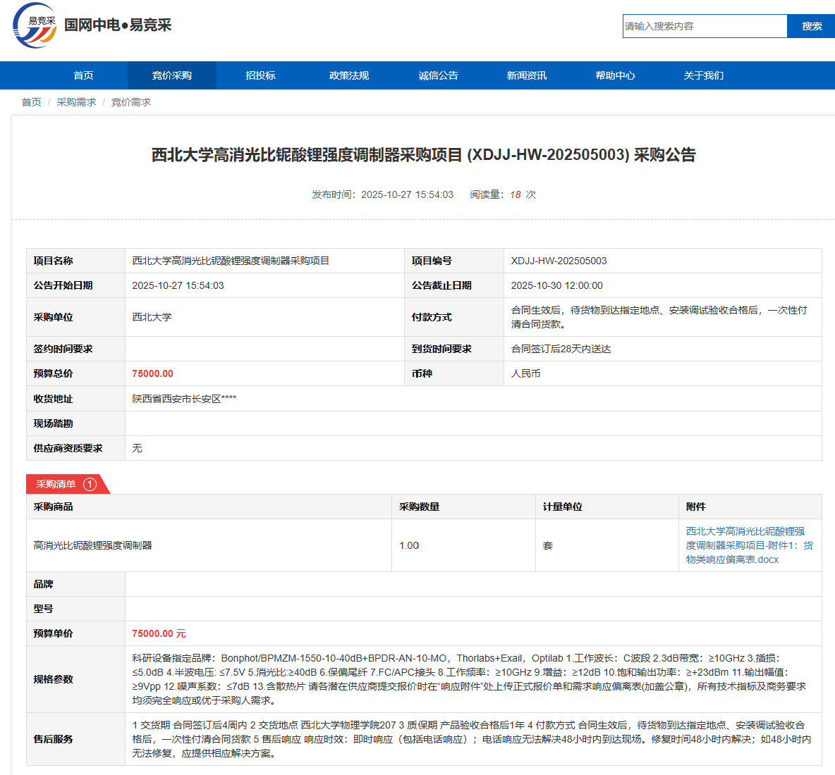 437ccm·必赢国际高消光比铌酸锂强度调制器采购项目(XDJJ-HW-202505003)竞价采购公告