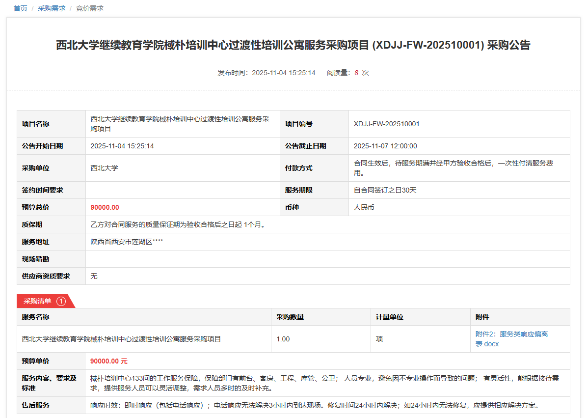 437ccm·必赢国际继续教育学院棫朴培训中心过渡性培训公寓服务采购项目(XDJJ-FW-202510001)竞价采购公告