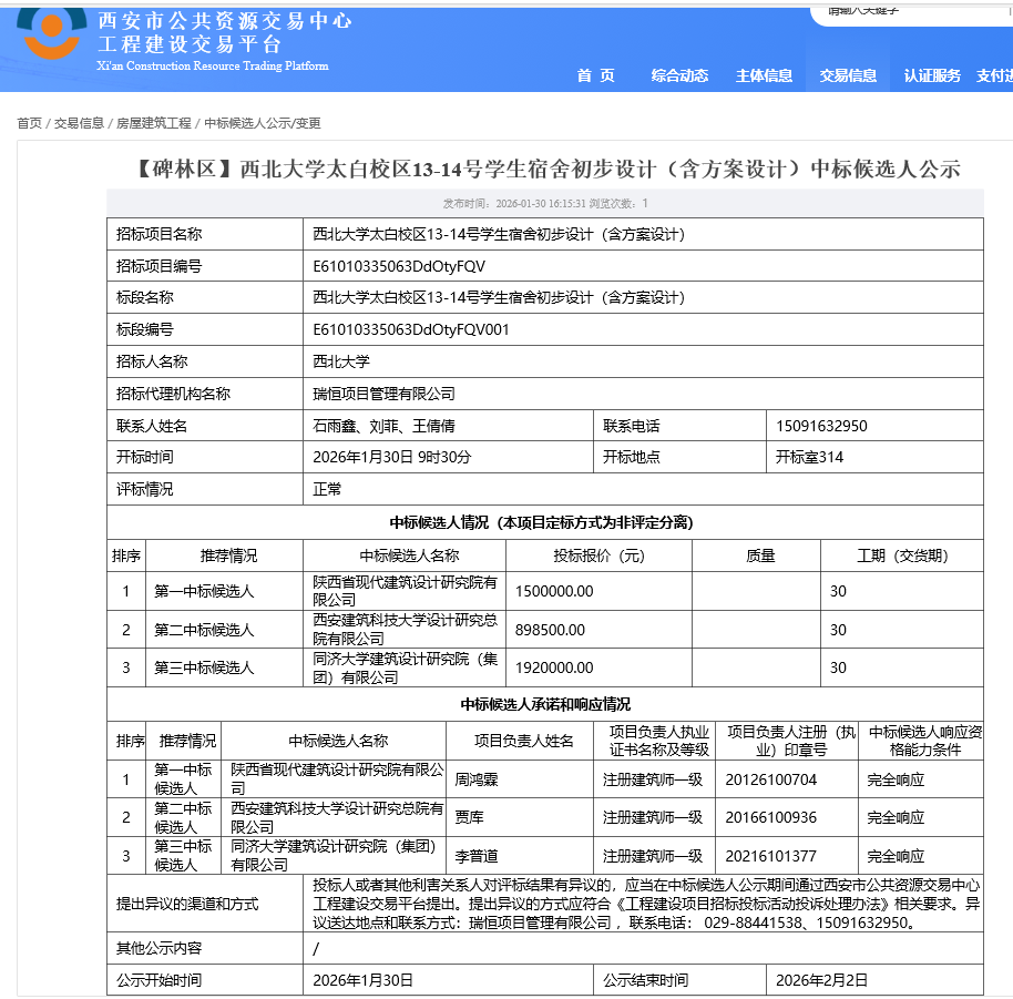 437ccm·必赢国际太白校区15-16号学生宿舍初步设计(含方案设计)中标候选人公示